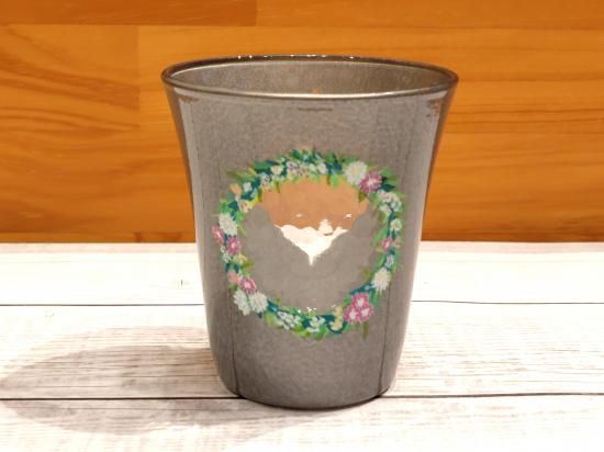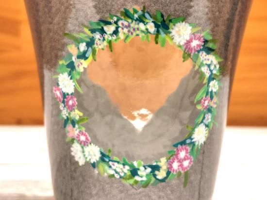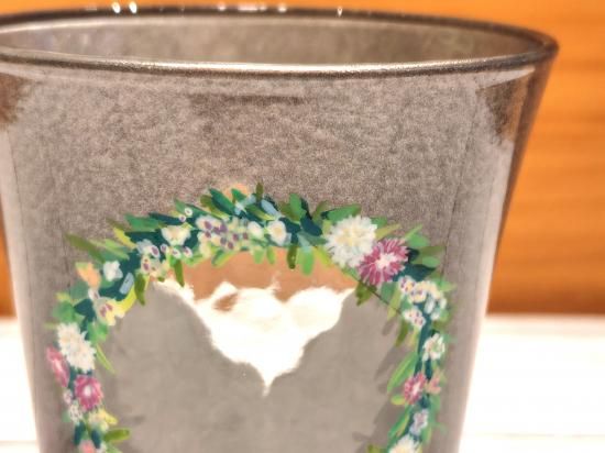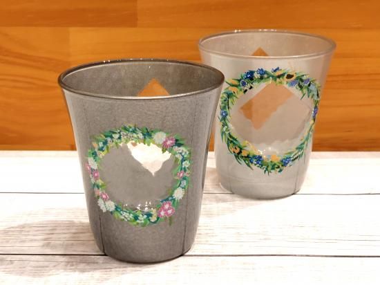 フリーグラスにフラワーリースを描きました。四角い窓から飲み物が見えます。