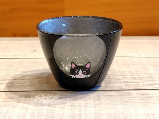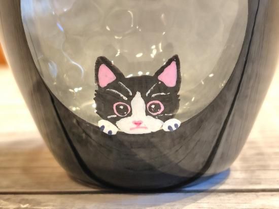 黒と白の模様のハチワレ猫をお月見グラスのミニグラスに描きました。酒どころ会津のお土産としてもおススメです。