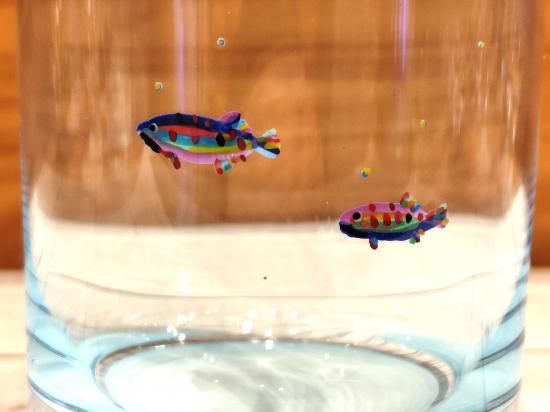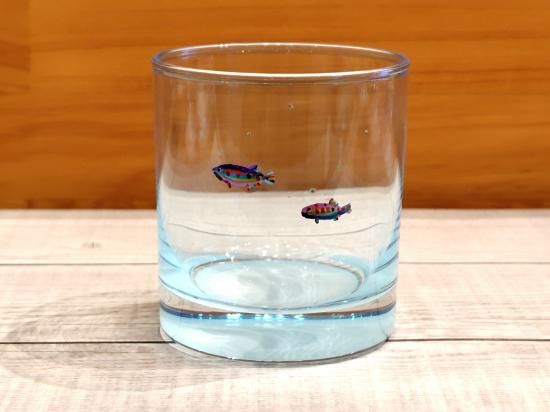 カラフルなヤマメを描いたロックグラス。ウイスキーなどのお酒、ジュースなどにおススメのサイズです。